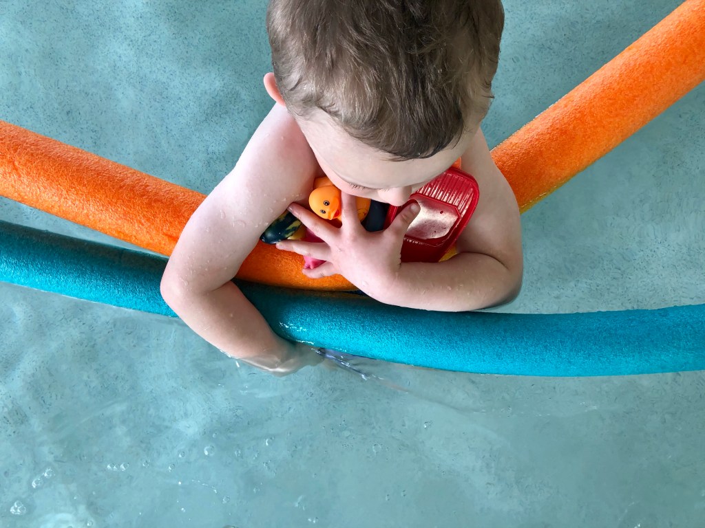 They weren’t actually HIS toys, the pool doesn’t let you bring your own in. However, my son, nearly 3 year old E, was the first one in the pool that day. He also was the one who originally collected the toys and deposited them in the kids swim area. So, although they weren’t technically his, they were for the duration of our swim that day, at least that’s how he understood it.